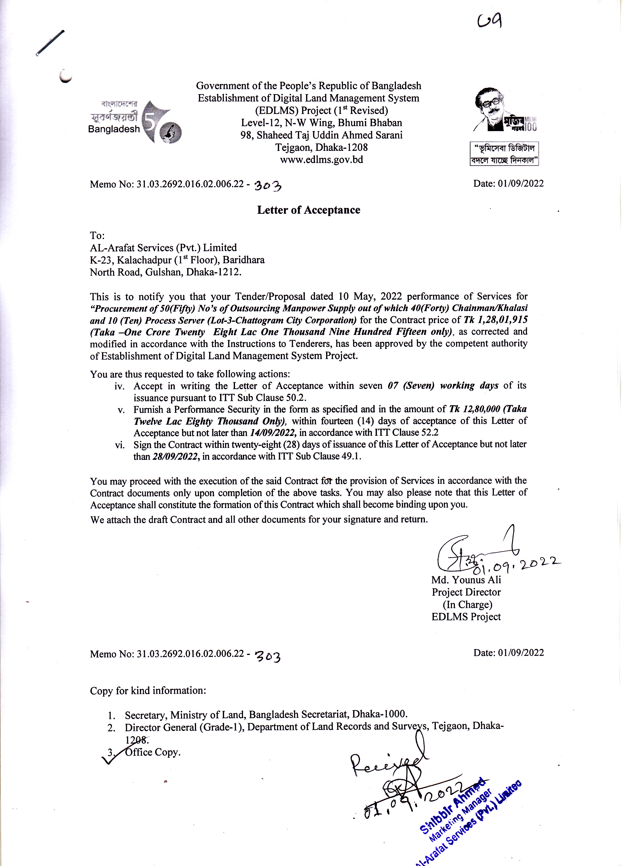 EDLMS Project এর Outsourcing পদ্ধতিতে নিয়োগের Tender Lot-3 এর Letter of Acceptance.